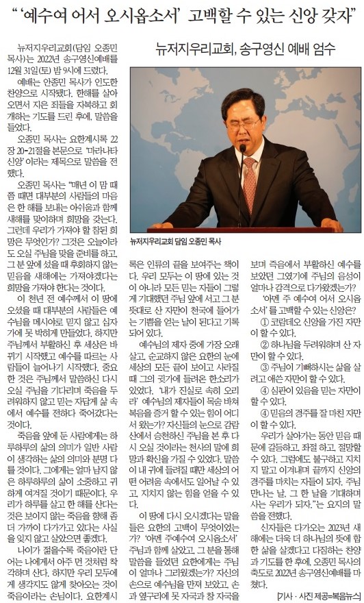 복음뉴스 제공 2023년 1월 4일(수) 자 뉴욕일보 A4면 기사
