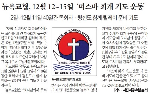 뉴욕교협, 12월 12~15일 '미스바 회개 기도 운동'