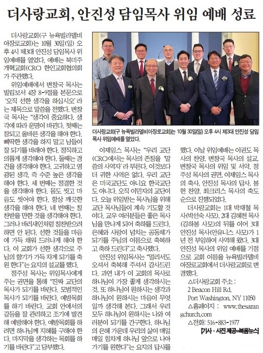 복음뉴스 제공 2022년 11월 19일(토) 자 뉴욕일보 A3면 기사