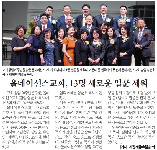 복음뉴스 제공 2022년 5월 21일(토) 자 뉴욕일보 A3면 기사