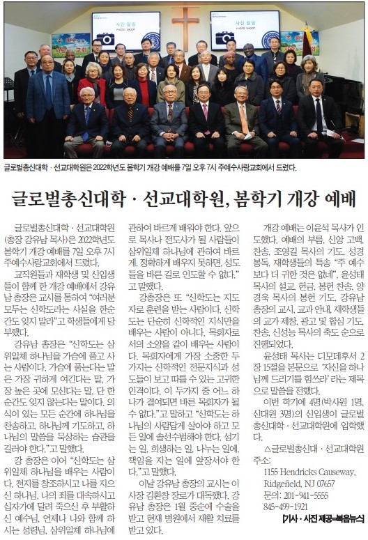 복음뉴스 제공 2022년 2월 12일(토) 자 뉴욕일보 A3면 기사