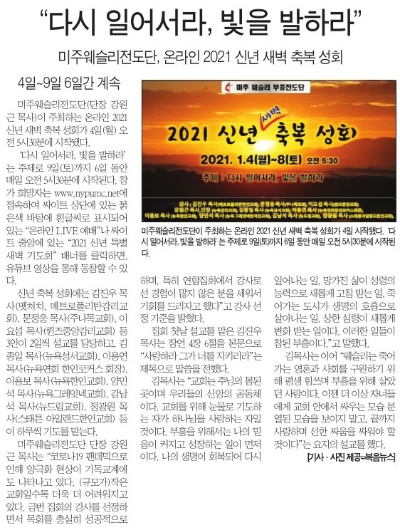 복음뉴스 제공 2021년 1월 7일(목) 자 뉴욕일보 A2면 기사