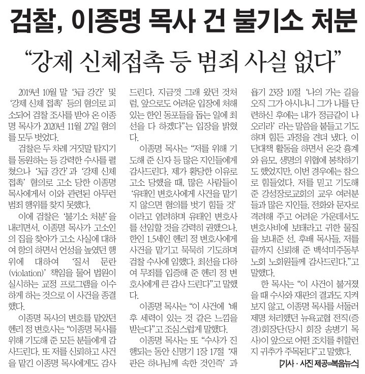 검찰, 이종명 목사 건 불기소 처분 --- "강제 신체 접촉 등 범죄 사실 없다"