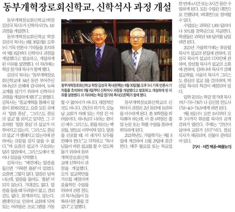 복음뉴스 제공 2021년 9월 4일(토) 자 뉴욕일보 A3면 기사
