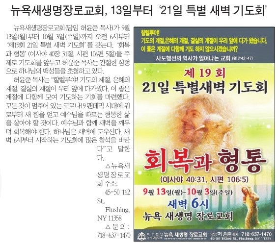 복음뉴스 제공 2021년 9월 8일(수) 자 뉴욕일보 A2면 기사
