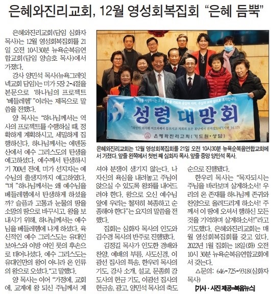 복음뉴스 제공 2021년 12월 23일(목) 자 뉴욕일보 A2면 기사