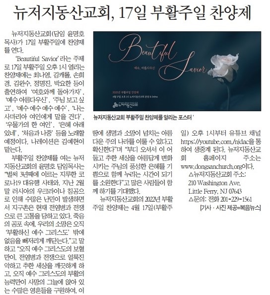 복음뉴스 제공 2022년 4월 11일(월) 자 뉴욕일보 A4면 기사