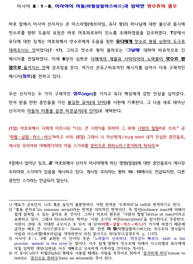 이사야 8장 1-8절 이사야의 아들(마헬살랄하스바스)과 임박한 앗수르의 홍수 작성자 정보 한삼현 목사 작성 작성일 2025.03.08 10:13 컨텐츠 정보 목록 본문 ⓒ 복음뉴스(BogEumNews.Com) SNS 공유 관련자료 댓글 0 등록된 댓글이 없습니다. 로그인한 회원만 댓글 등록이 가능합니다. 목록