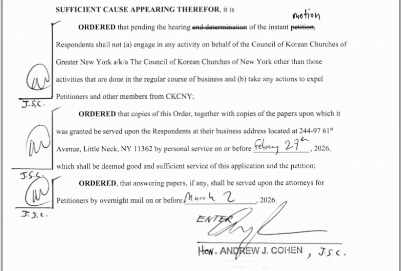 뉴욕주 대법원 브롱스 카운티(담당 Andrew J. Cohen 판사)는 2월 9일, 뉴욕지구한인교회협의회(CCKNY) 제52대 회장 선출과 관련한 소송에서 ‘소명명령(Order to Show Cause)’을 발부했다. 청구인은 THE SAMMUL PRESBYTERIAN CHURCH(샘물교회)와 JOYFUL CHURCH OF NEW YORK(뉴욕늘기쁜교회)이며, 피청구인은 허연행 목사와 뉴욕지구한인교회협의회 등이다.