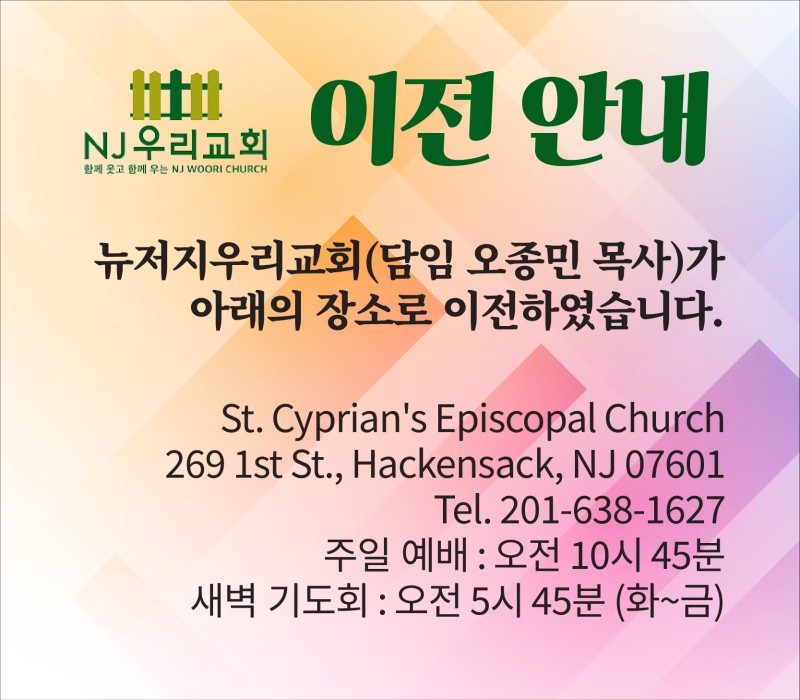 뉴저지우리교회 예배 처소 이전 안내