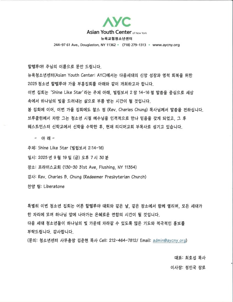 2025 청소년 할렐루야 가을 부흥집회 작성자 정보 A Y C 작성 작성일 2025.07.19 06:39 컨텐츠 정보 목록 본문 . SNS 공유 관련자료 댓글 0 등록된 댓글이 없습니다. 로그인한 회원만 댓글 등록이 가능합니다. 목록