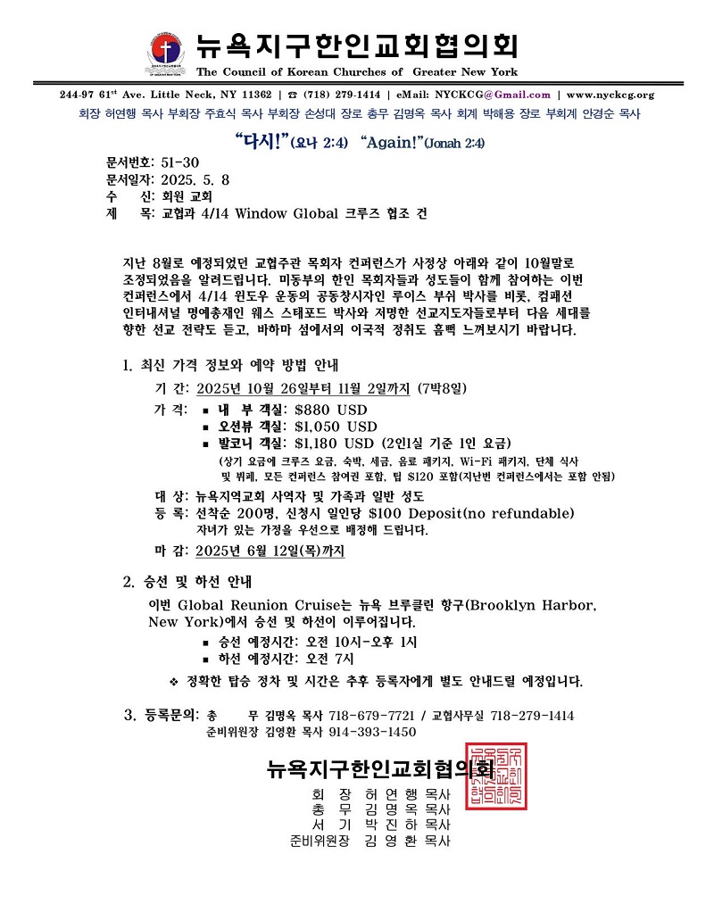 뉴욕교협과 4/14 Window Global 크루즈 일정 변경 안내