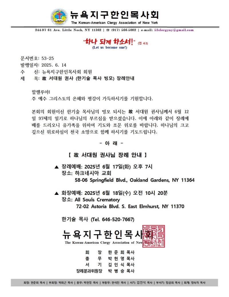 고 서대원 권사님 (한기술 목사 빙모) 장례 일정 안내 작성자 정보 뉴욕목사회 작성 작성일 2025.06.14 11:52 컨텐츠 정보 목록 본문 . SNS 공유 관련자료 댓글 0 등록된 댓글이 없습니다. 로그인한 회원만 댓글 등록이 가능합니다. 목록