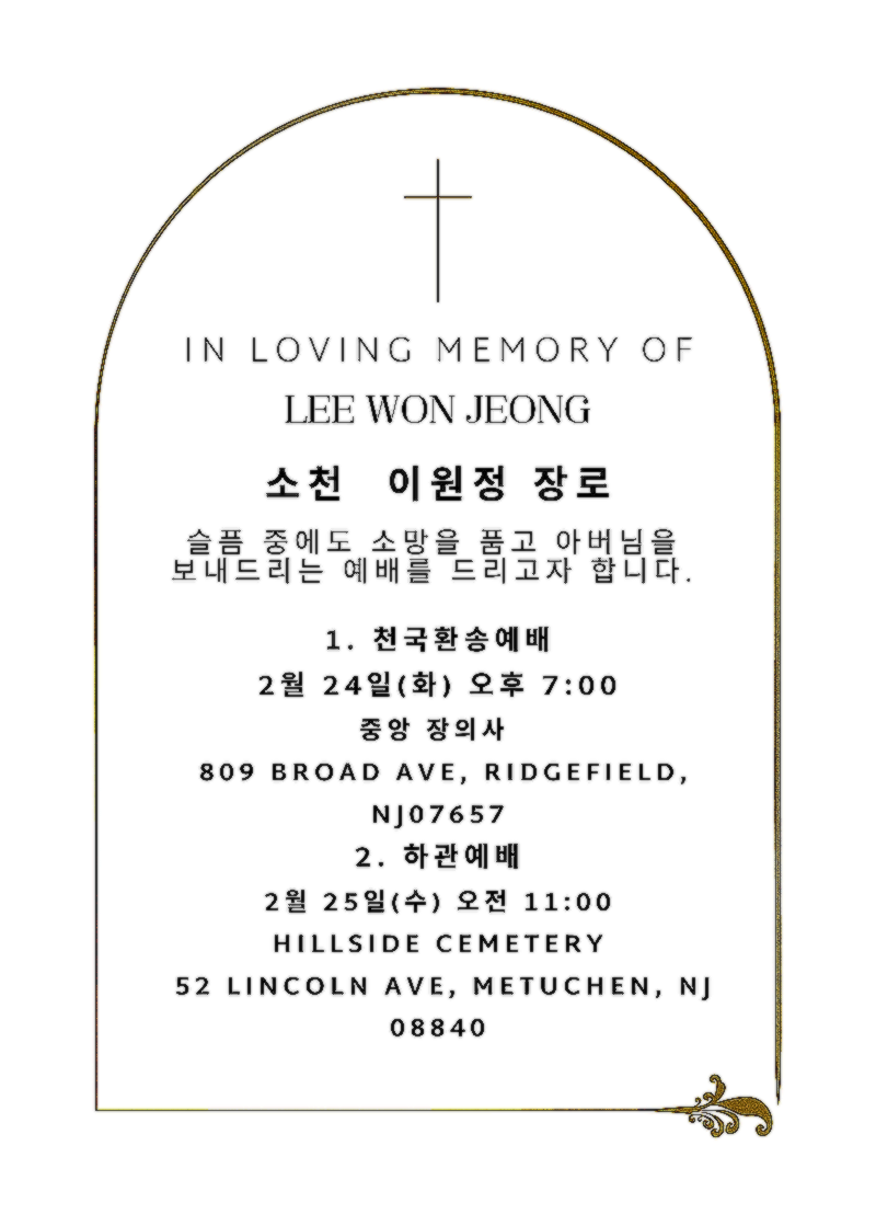 고 이원정 장로(이건화 목사 부친) 장례 일정 안내 작성자 정보 주예수사랑교회 작성 작성일 2026.02.22 06:22 컨텐츠 정보 목록 본문 . SNS 공유 관련자료 댓글 0 등록된 댓글이 없습니다. 로그인한 회원만 댓글 등록이 가능합니다. 목록