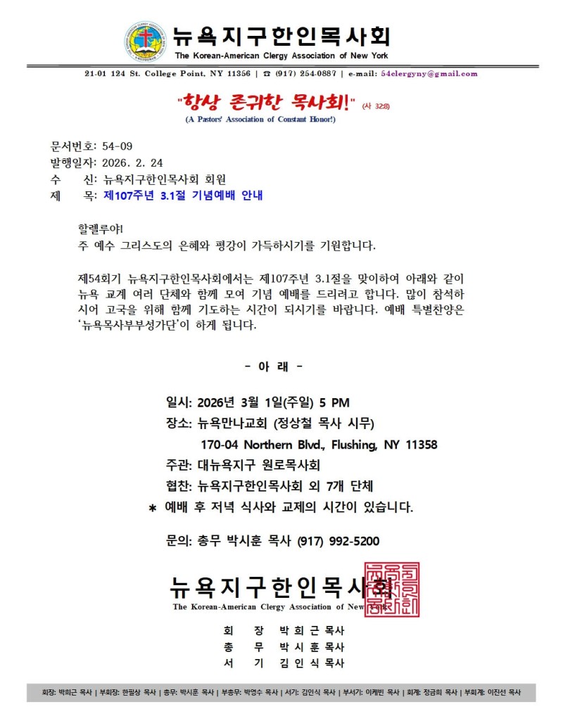 제107주년 3.1절 기념 예배 안내 작성자 정보 뉴욕목사회 작성 작성일 2026.02.24 13:34 컨텐츠 정보 목록 본문 . SNS 공유 관련자료 댓글 0 등록된 댓글이 없습니다. 로그인한 회원만 댓글 등록이 가능합니다. 목록