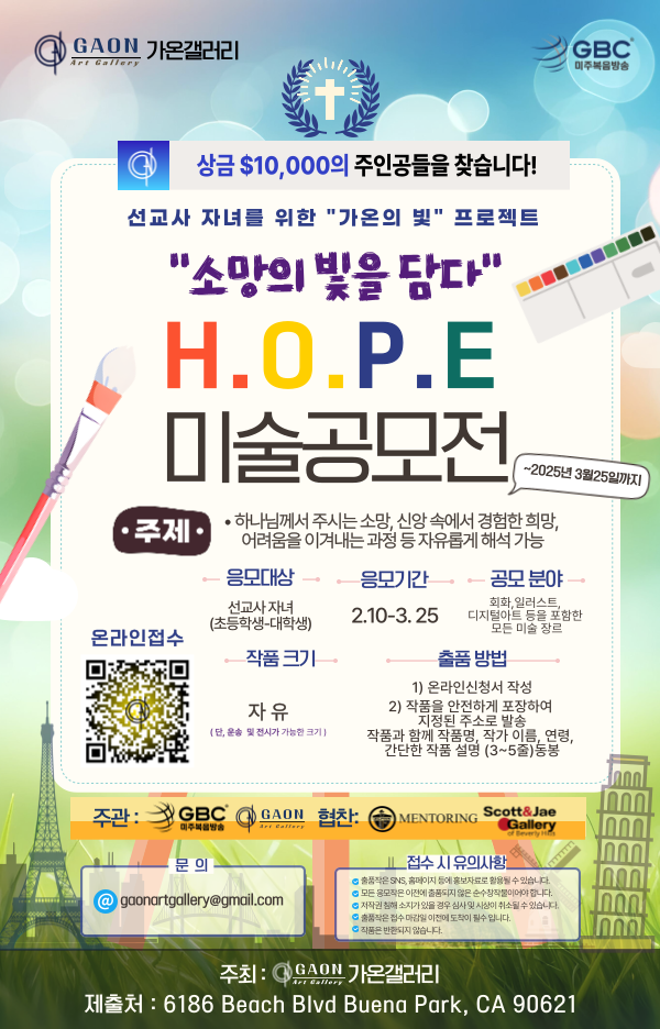 선교사 자녀들의 예술적 재능을 발굴하고 지원하기 위한 특별한 미술 공모전, ‘가온의 빛프로젝트 H.O.P.E 미술 공모전이 오는 325일까지 진행된다. ‘가온은 순우리말로 중심을 의미하며, 히브리어로는 탁월함이라는 뜻을 지닌다. 이처럼 가온의 빛프로젝트는 각자의 재능과 탁월함을 통해 하나님께서 심어주신 꿈과 소망이 세상 속에 펼쳐지길 바라는 마음으로 시작되었다. 특히, 세계 각지에서 사역하는 선교사 가정의 자녀들이 열악한 환경 속에서도 하나님이 주신 꿈을 발견하고 성장할 수 있도록 돕기 위해 특별히 선교사 자녀를 위한 미술 공모전으로 기획되었다.