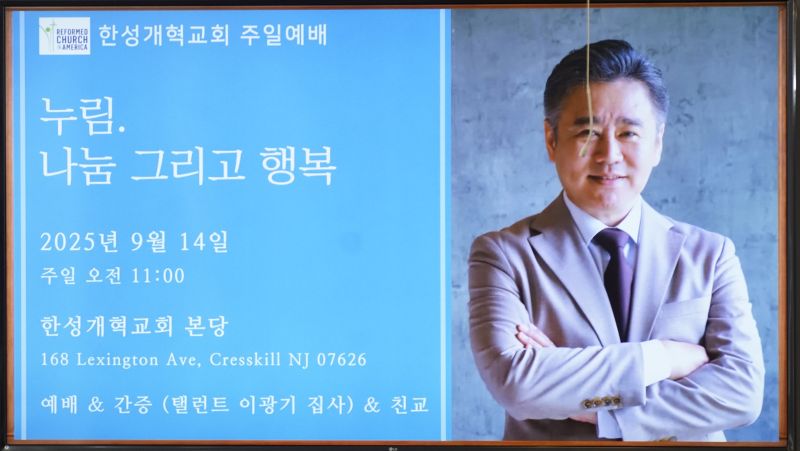 한성개혁교회(담임 송호민 목사)는 9월 14일 주일에 의미있는 주일 예배를 드렸다. '2025 뉴저지 호산나 전도 집회'에서 13일(토) 저녁에 간증을 한 배우 이광기 집사를 초청하여 간증을 듣는 시간을 가졌다. 이광기 집사의 간증에 앞서 드린 주일 예배는 담임 송호민 목사가 인도했다.
