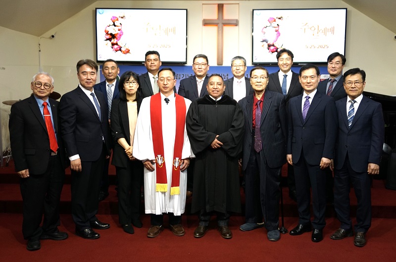 앞줄 왼쪽부터 정완기 목사, 이원제 목사, 강그레이스 목사, 황용석 목사, 마리오 장로, 강유남 목사, 김장환 목사, 조홍범 목사