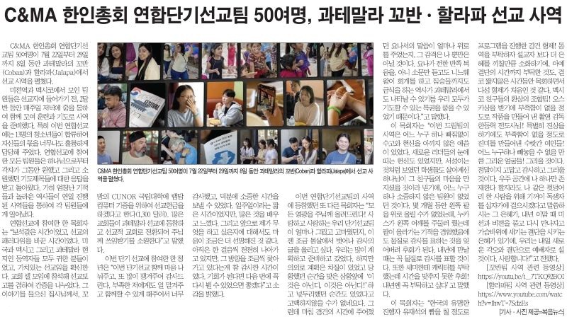 C&MA 한인총회 연합단기선교팀 50여명, 과테말라 꼬반 & 할라파 선교 사역 작성자 정보 복음뉴스 작성 작성일 2025.08.17 17:13 컨텐츠 정보 목록 본문 복음뉴스 제공 2025년 8월 13일(수) 자 뉴욕일보 A4면 기사 SNS 공유 관련자료 댓글 0 등록된 댓글이 없습니다. 로그인한 회원만 댓글 등록이 가능합니다. 목록