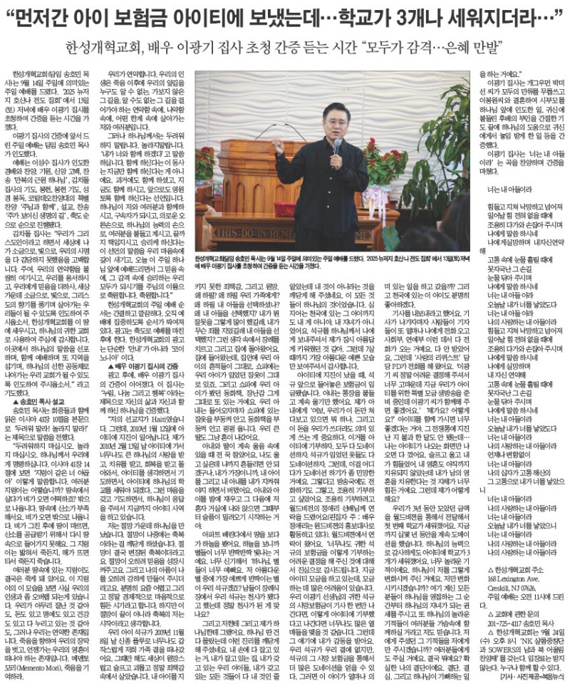 복음뉴스 제공 2025년 9월 20일(토) 자 뉴욕일보 A10면 기사
