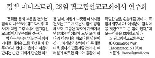 컴백 미니스트리, 28일 필그림선교교회에서 연주회