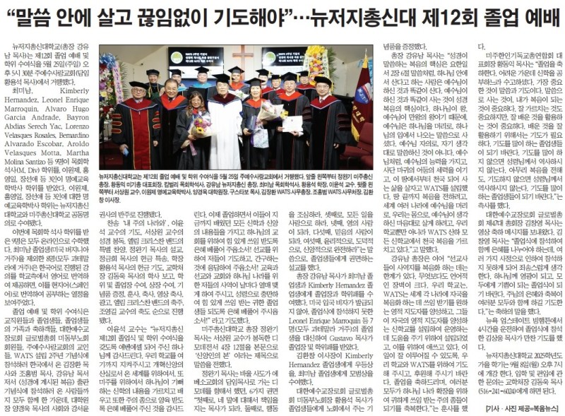 "말씀 안에 살고 끊임없이 기도해야" --- 뉴저지총신대 제12회 졸업 예배