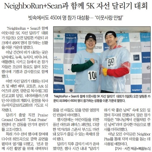 NeighborRun + Sean과 함께 5K 자선 달리기 대회 작성자 정보 복음뉴스 작성 작성일 2025.04.23 05:20 컨텐츠 정보 목록 본문 복음뉴스 제공 2025년 4월 23일(수) 자 뉴욕일보 A4면 기사 SNS 공유 관련자료 댓글 0 등록된 댓글이 없습니다. 로그인한 회원만 댓글 등록이 가능합니다. 목록