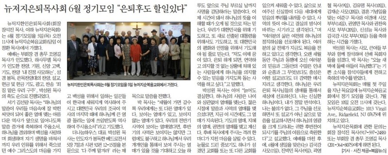 뉴저지은퇴목사회 6월 정기모임 "은퇴후도 할일있다" 작성자 정보 복음뉴스 작성 작성일 2025.06.10 05:21 컨텐츠 정보 목록 본문 복음뉴스 제공 2025년 6월 10일(화) 자 뉴욕일보 A4면 기사 SNS 공유 관련자료 댓글 0 등록된 댓글이 없습니다. 로그인한 회원만 댓글 등록이 가능합니다. 목록