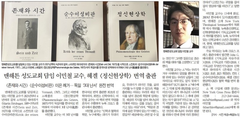 맨해튼 성도교회 담임 이민철 교수, 헤겔 <정신현상학> 번역 출판 작성자 정보 복음뉴스 작성 작성일 2025.06.14 06:19 컨텐츠 정보 목록 본문 복음뉴스 제공 2025년 6월 14일(토) 자 뉴욕일보 A4면 기사 SNS 공유 관련자료 댓글 0 등록된 댓글이 없습니다. 로그인한 회원만 댓글 등록이 가능합니다. 목록