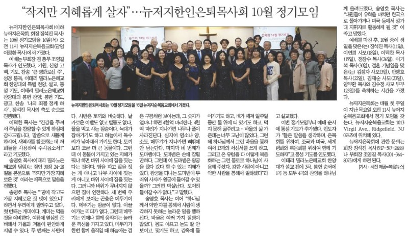 "작지만 지혜롭게 살자" --- 뉴저지한인은퇴목사회 10월 정기모임 작성자 정보 복음뉴스 작성 작성일 2025.10.18 05:13 컨텐츠 정보 목록 본문 복음뉴스 제공 2025년 10월 18일(토) 자 뉴욕일보 A10면 기사 SNS 공유 관련자료 댓글 0 등록된 댓글이 없습니다. 로그인한 회원만 댓글 등록이 가능합니다. 목록