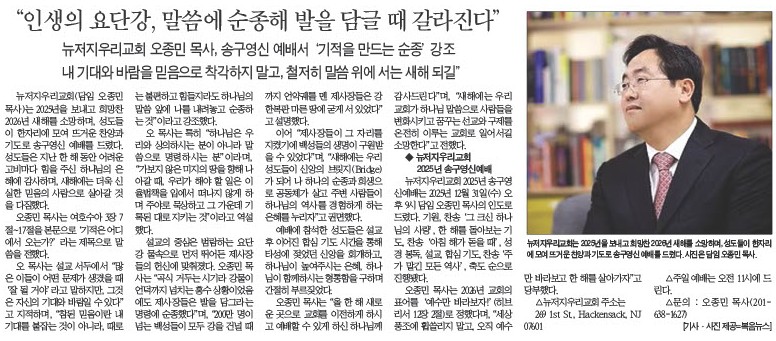 "인생의 요단강, 말씀에 순종해 발을 담글 때 갈라진다" 작성자 정보 복음뉴스 작성 작성일 2026.01.08 08:58 컨텐츠 정보 목록 본문 복음뉴스 제공 2026년 1월 8일(목) 자 뉴욕일보 A4면 기사 SNS 공유 관련자료 댓글 0 등록된 댓글이 없습니다. 로그인한 회원만 댓글 등록이 가능합니다. 목록