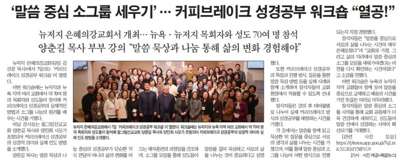 '말씀 중심 소그룹 세우기' --- 커피브레이크 성경 공부 워크숍 "열공!" 작성자 정보 복음뉴스 작성 작성일 2026.03.12 06:37 컨텐츠 정보 목록 본문 복음뉴스 제공 2026년 3월 12일(목) 자 뉴욕일보 A4면 기사 SNS 공유 관련자료 댓글 0 등록된 댓글이 없습니다. 로그인한 회원만 댓글 등록이 가능합니다. 목록