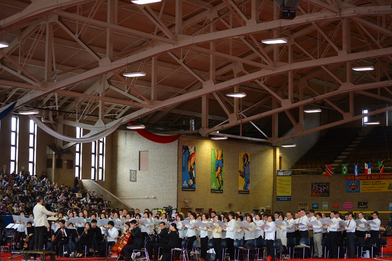 두 학생이 마태복음 28장 1-10절을 한국어와 영어로 봉독한 후에 연합 성가대가 "담대히 외쳐라"를 힘있게 불렀다.
