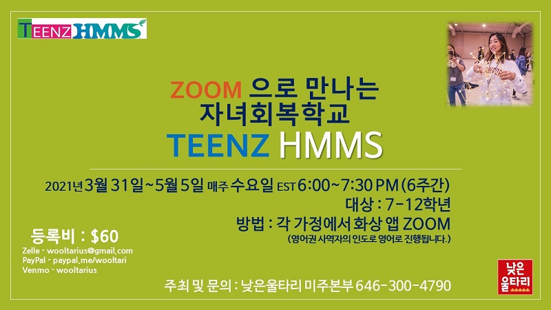 낮은울타리 미주본부(대표간사 : 조희창 목사)에서 6주과정으로 틴 자녀들을 위한 "자녀회복학교(TEENZ HMMS)"를 연다.
