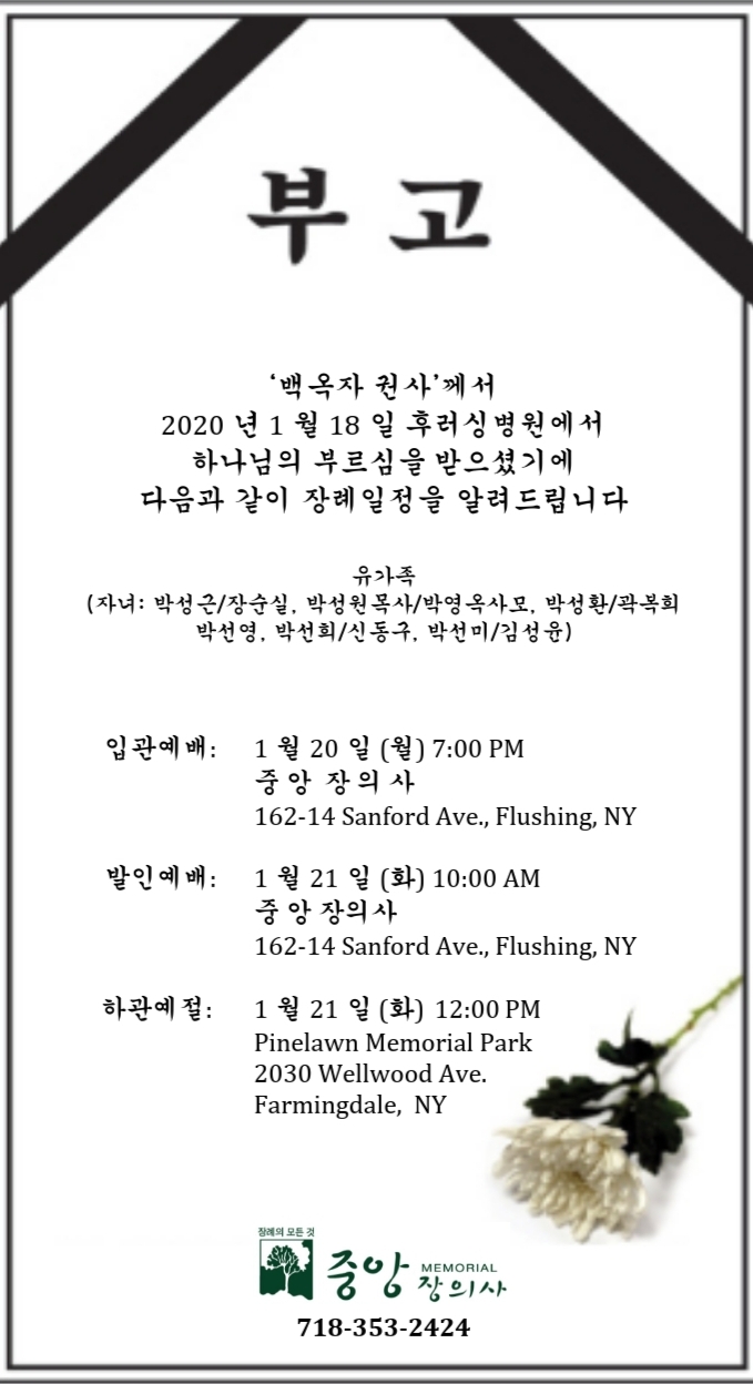 박성원 목사(뉴욕나눔의집 대표)의 모친 백옥자 권사가 1월 18일 후러싱병원에서 별세했다.