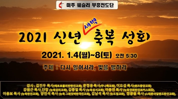 "다시 일어서라, 빛을 발하라" - 웨슬리부흥전도단, 2021 신년 축복 성회 개막미주웨슬리전도단(단장 강원근 목사)이 주최하는 2021 신년 새벽 축복 성회가 4일(월) 오전 5시 30분에 시작됐다. "다시 일어서라, 빛을 발하라"라는 주제로 오는 8일(토)까지 6일 동안 매일 오전 5시 30분에 시작되는 금번 새벽 축복 성회는 온라인으로 진행된다. www.nypumc.net에 접속하여 싸이트 상단에 있는 붉은색 바탕에 흰글씨로 표시되어 있는 "온라인 LIVE 예배"나 싸이트 중앙에 있는 "2021 신년 특별 새벽 기도회" 배너를 클릭하면, 유튜브 영상을 통하여 미주웨슬리전도단의 2021 신년 축복 성회에 동참할 수 있다.