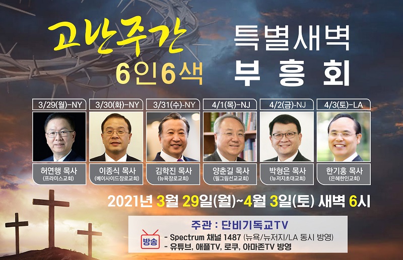 뉴욕과 뉴저지, 그리고 LA지역을 포함해 6명의 목사들이 고난주간인 329일 월요일부터 43일 토요일까지 6일 동안 돌아가면서 매일 새벽 6(동부시간)에 말씀을 전하게 된다.