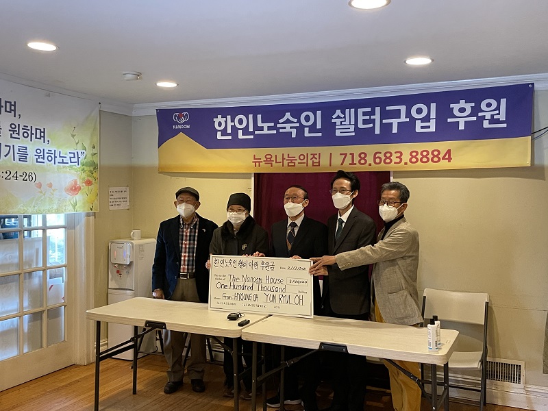 오연률 권사, 뉴욕나눔의집에 쉘터 마련 후원금 $ 100,000 전달퀸즈에 거주하고 있는 오연률 권사(90세)가 4월 13일(화)에 뉴욕나눔의집을 방문하여 쉘터 마련을 위한 후원금 십만 불을 전달했다. 작년 4월에 코로나로 남편과 사별한 오 권사는 "돈을 가치있게 사용해야겠다는 생각이 들어, 어렵게 살아가고 있는 한인 노숙인들을 돕고 있는 뉴욕나눔의집을 찾게 되었다"고 말했다.