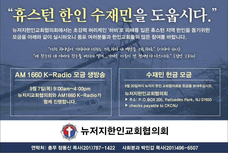 뉴저지 교협(회장 김종국 목사)은 휴스턴 지역의 수재민들을 돕기 위한 모금 생방송을 오늘(7일,목) AM 1660 K-radio 를 통하여 실시한다. 많은 동참을 바라고 있다.