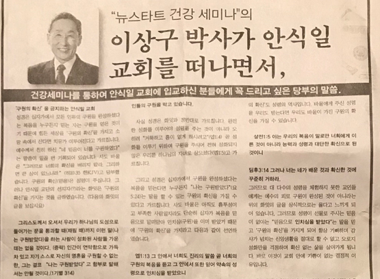 <CA> ‘뉴스타트 건강 세미나’로 잘 알려진 안식일교회의 이상구 박사가 미주 모 일간지에 전면 광고를 통해 안식교 퇴교를 공개적으로 밝혀 화제가 되고 있다.