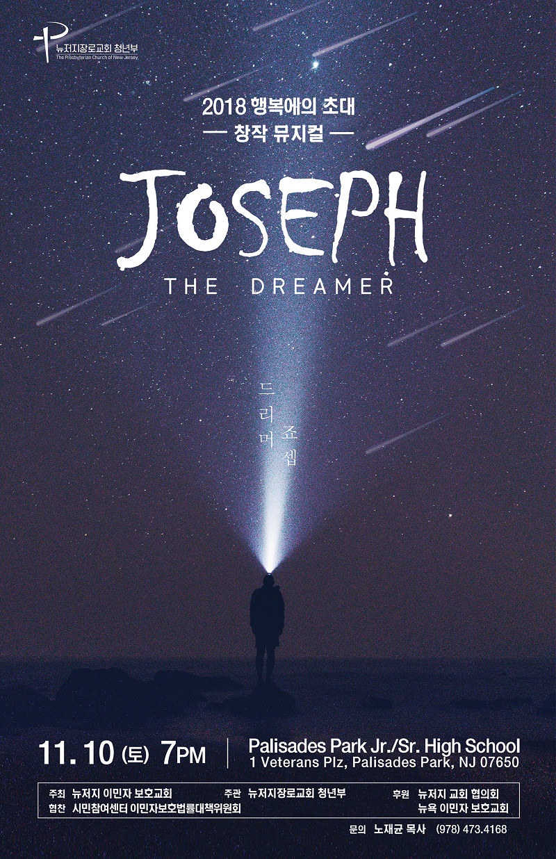 뉴저지이민자보호교회가 주최하고, 뉴저지장로교회 청년부가 주관하는 창작 뮤지컬 '드리머 조셉' 공연이 10일(토) 오후 7시에 팰리세이드파크고등학교 강당에서 열린다.