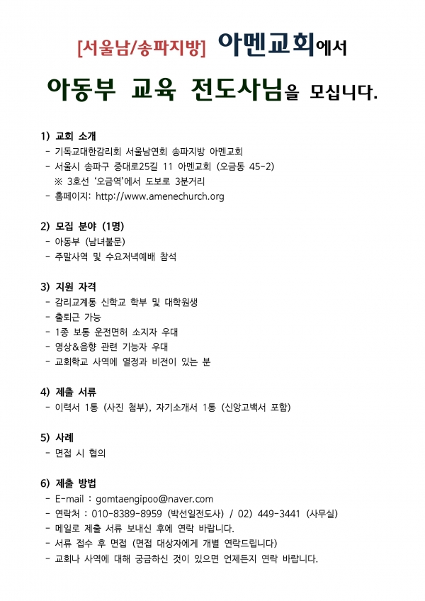서울 송파 아멘교회에서 교육(파트) 전도사님을 모십니다.