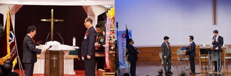 오른쪽에 있는 사진에는, 뉴욕 교협 회장 양민석 목사와 위촉장을 수여 받는 김진우 목사가 단의 한 쪽으로 밀려나 있습니다. 중앙에 있는 단에는 서기 문정웅 목사가 서 있습니다.