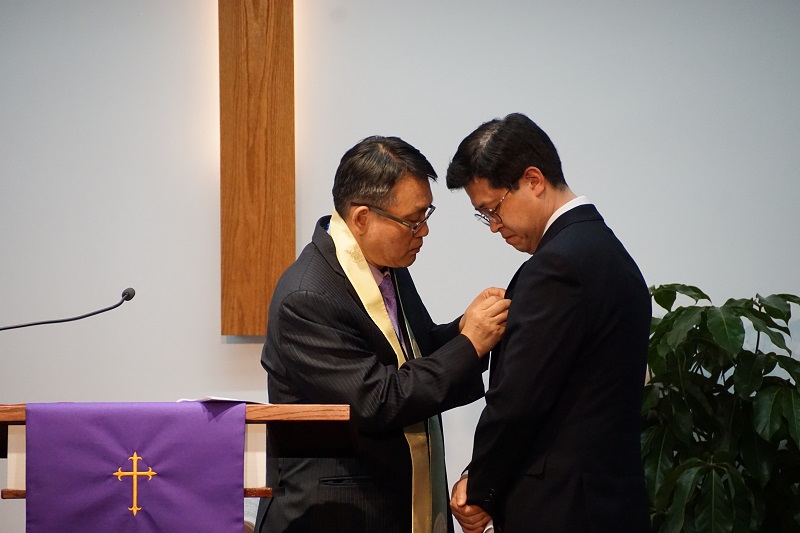 김승현 목사에게 노회원 뱃지를 달아주고 있는 노회장 빈상석 목사
