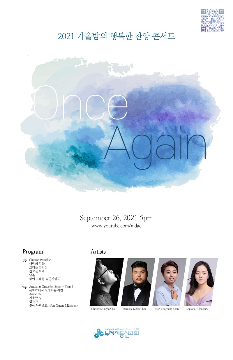 그러므로 코로나 상황속에서 잠시 놓쳤던 기쁨과 행복을 ‘주안에서 다시 찾는다’는 의미에서 ‘Once again’이라는 주제로 오는 9월 26일 주일, 오후 5시에 뉴욕과 뉴저지에서 활동하는 탁월한 음악가분들을 모시고 ‘가을밤의 행복한 찬양 콘서트’를 갖고자 합니다. 뉴저지동산교회 본당과 온라인에서 하이브리드로 함께 진행하는 이 행사를 위해 아름다운 클라리넷 악기 연주와, 행복한 향수를 자아내는 멋진 한국 가곡들, 또한 은혜가 충만한 감동적인 찬양곡들을 준비했습니다.