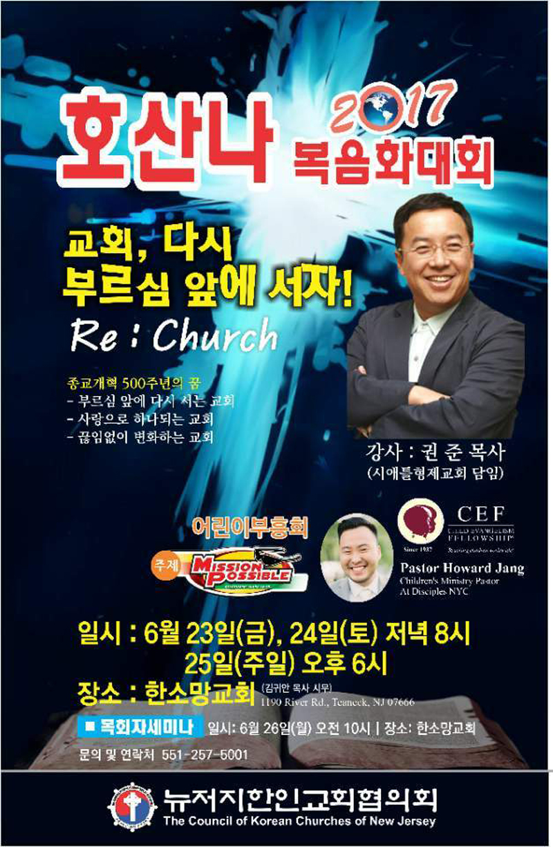 2017 호산나 복음화 대회를 준비해 뉴저지 교협(회장 김종국 목사) 쭈욱 지켜봐 기자가 자신있게 있는 말이다. 정말(기자는 단어를 첨가하는 것을 아주 싫어한다. '정말' 넣어야 한다면, '정말' 들어가 있지 않은 말은 거짓이라는 이야기니까. 그럼에도 '정말' 첨가했다. 강조하는 표현으로 이해하기 바란다) 많이 준비했다. 정말 열심히 준비했다. 그리고 오랫동안 기도했다. 동안 5차례의 준비 기도회를 지역을 순회하며 가졌다. 마지막 기도회를 대회 개막 하루 전에 22() 오전 10 30분에 소망교회(담임 박상천 목사)에서 갖는다.
