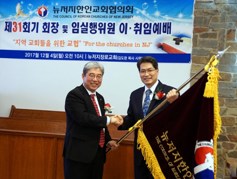 전임 김종국 회장으로부터 뉴저지 교협기를 넘겨 받은 윤명호 목사가 취임사를 했다. 임원 구성이 늦어져 여느 회기에 비하여 많이 늦은 취임식을 갖게 된 윤명호 목사는 "교협 31회기 회장으로 취임하도록 인도하신 하나님께 영광을 올려드린다. 회장직을 맡게 되어 부회장 때와 달리 어깨가 무겁다. 그 무게가 총회 때부터 느껴지게 되었다. 많이 부족하다고 생각한다. 여러분들의 도움이 필요하다. 교협은 결국 함께 하고, 함께 세워가는 것이다. 보통 30년을 한 세대라 할 때, 31년은 다음 세대로 이어가는 첫 해이다.어디로 갈 것인지 고민이 많았다. 그리고 사람들과 만나 의견을 듣고 기도하면서 대략적으로 두 가지 방향을 잡았다. 과거를 돌아보는 일과 미래를 바라보는 일이다.