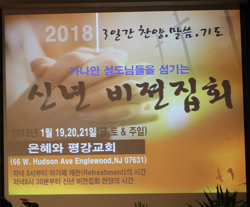 '가나안 성도님들을 섬기는 신년 비젼 집회'가 열리는 은혜와 평강교회(Grace & Peace Church)는 66W Hudson Ave., Englewood, NJ 07631 에 위치하고 있다.