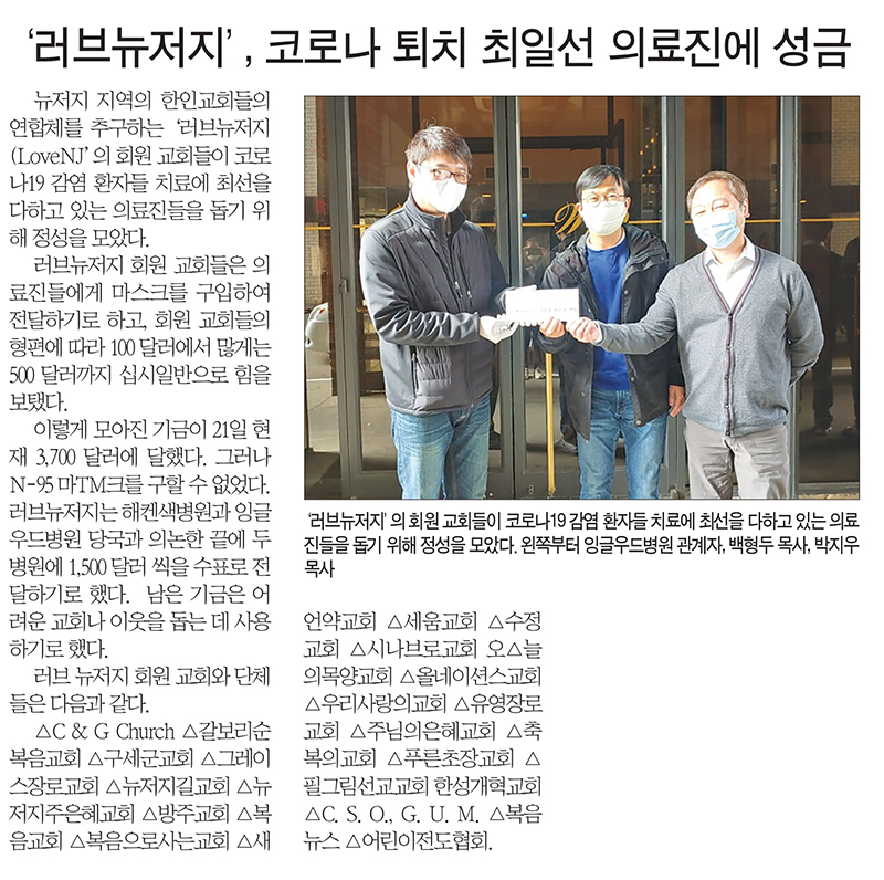 '러브뉴저지', 코로나 퇴치 최일선 의료진에 성금