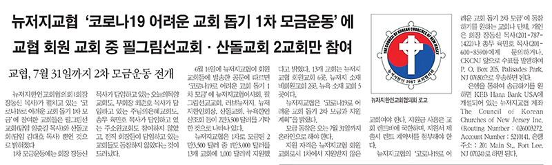 뉴저지교협 '코로나19 어려운 교회 돕기 1차 모금운동'에 교협 회원 교회 중 필그림선교교회 산돌교회 2교회만 참여
